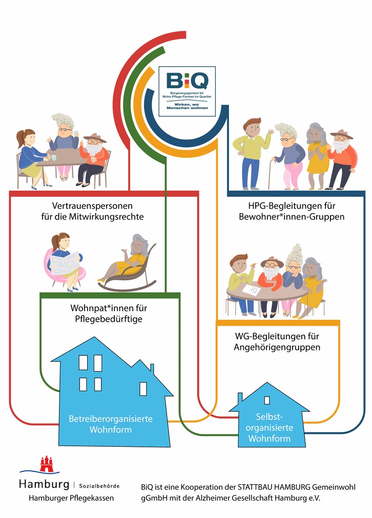 BiQ wird auf Grundlage der Mitwirkungsverordnung nach § 13 HmbWBG sowie des § 45c SGB XI in Verbindung mit § 8 HmbPEVO gefördert und anteilig von der Sozialbehörde und den Pflegekassen finanziert.